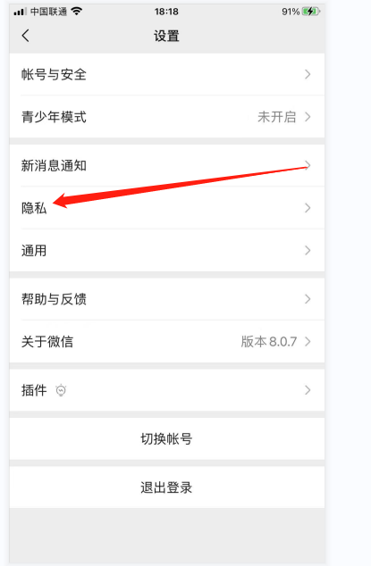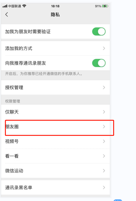 4.?进到隐私的界面后,点击朋友圈。