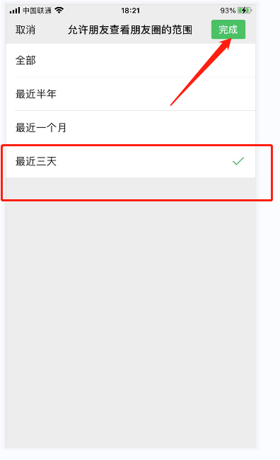 5.?进入到朋友圈权限界面后,点击允许朋友查看朋友圈的范围,选择最近显示三天,点击完成即可。