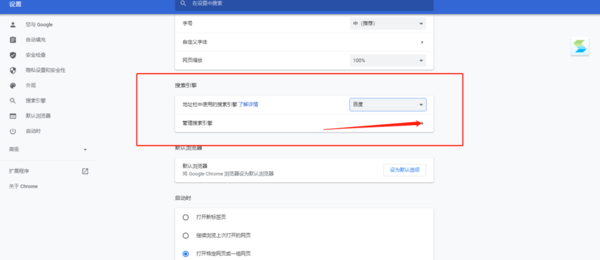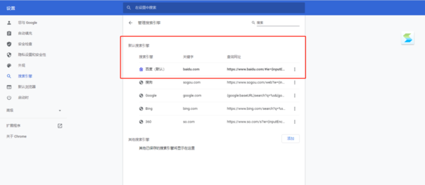 4.?点击管理搜索引擎后面的右三角图标,能够看到百度以及被设置为默认的搜索引擎,然后关闭谷歌浏览器。
