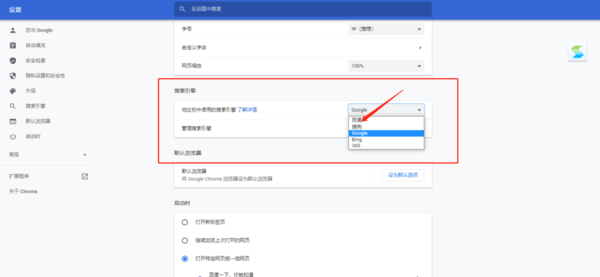 3.?在地址使用的搜索引擎后面,点击google后面的小三角,选择百度。