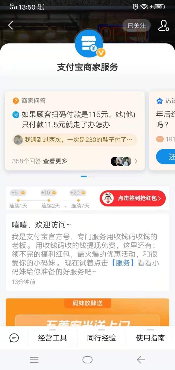 第七步,同时点击个人收款二维码底部的【商家服务】选项,进入到支付宝的商家服务界面当中后,我们再其下方的界面中,还可以申请领取支付宝的收钱码贴纸。
