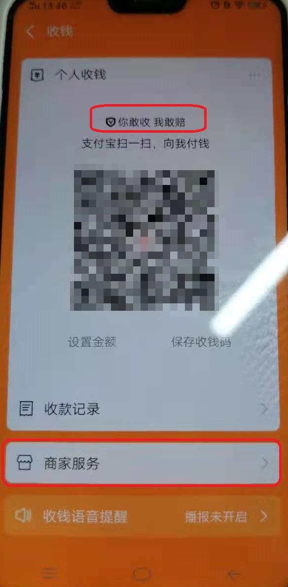 第六步,进入到支付宝的收钱界面后,在收款的界面的最上方,出现【你敢收?我敢赔】的字样,就可以将原有的个人收款二维码替换为商家收款二维码了。