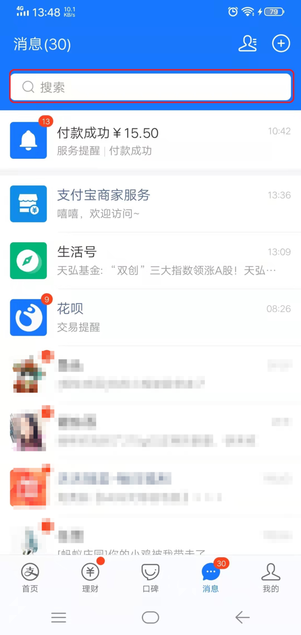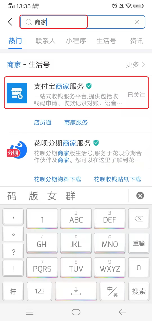 第二步,进入到支付宝的消息界面后,在最顶部的搜索框中输入【商家】两字然后进行搜索。然后在搜索的结果中,点击【支付宝商家服务】公众号。