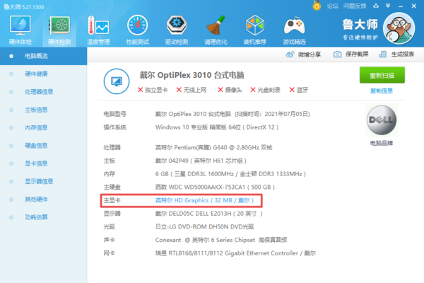 第四步,同时在鲁大师软件的主界面当中,我们还可以切换到【硬件检测】选项卡当中。