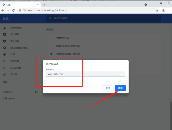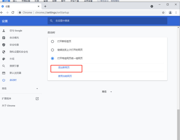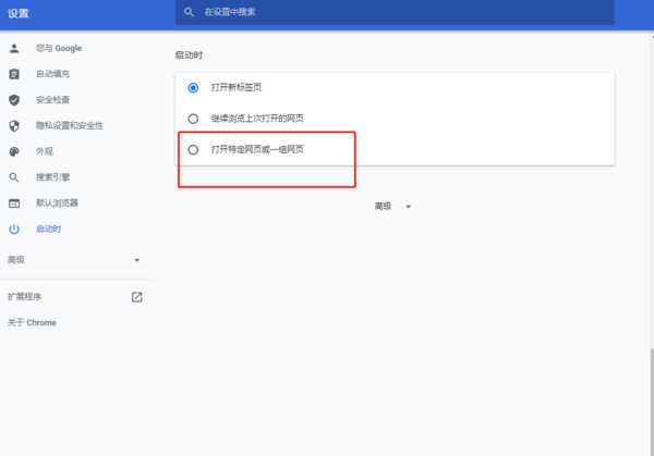 3.?找到启动时,点击打开特定网页或一组网页。