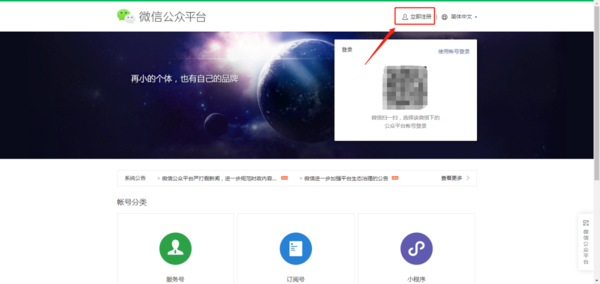 1、打开浏览器搜索微信公众平台,进入平台官网,点击右上角立即注册;