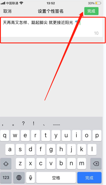 第五步:就进入到设置个性签名的界面了,然后就能够填写个性签名了,填写完后,点击完成即可。