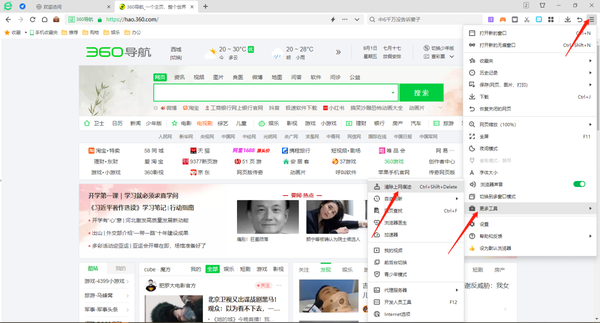 1、点击右上角的【显示浏览器工具及常用设置选项】,选择【更多工具】,在弹出的下拉菜单中点击【清除上网痕迹】。