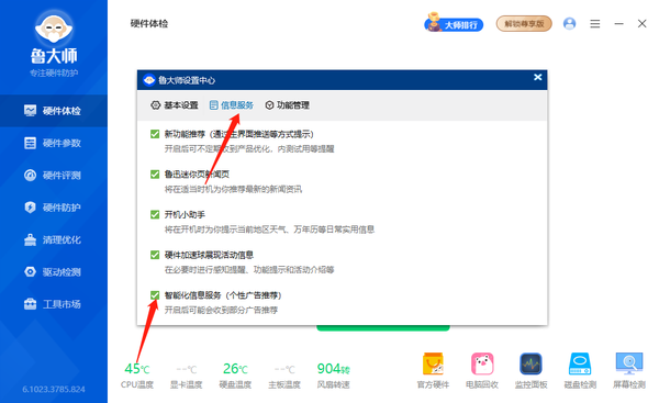2、在鲁大师设置中心信息服务界面找到【智能化信息服务】,同样也是将该功能取消勾选。