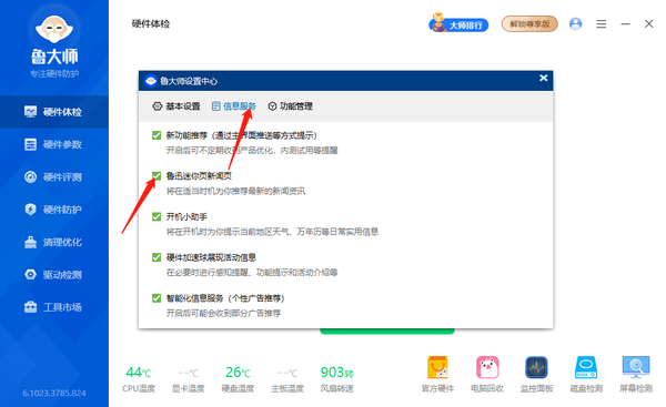 2、在鲁大师设置中心窗口上方,选择【信息服务】项,找到【鲁迅迷你页新闻页】,并关闭该功能即可。