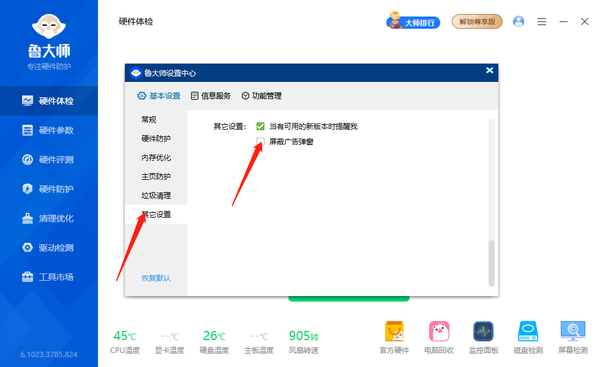 1、进入到鲁大师设置中心基本设置界面中,点击左侧的【其他设置】,找到【屏蔽广告弹窗】,取消勾选该功能。