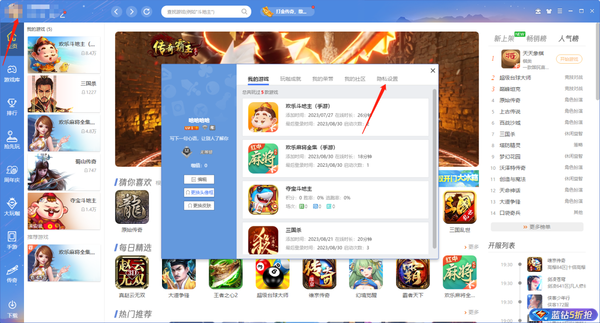 1、在电脑中启动QQ游戏大厅后进行登录,点击右上角的头像,进入到个人主页界面,在上方选择【隐私设置】。