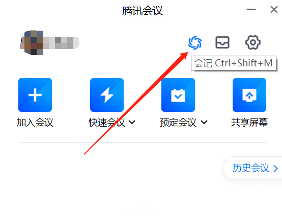 通过在电脑上登录腾讯会议,在主面板的右上角点击红色箭头所指图标,即可进入到会记工具的入口。