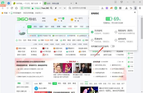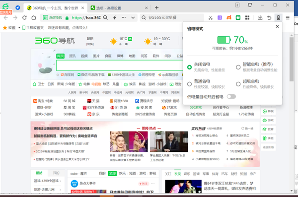 开启360安全浏览器省电模式后,笔记本续航时间将远超使用其他浏览器时的待机时长。360安全浏览器会在笔记本电脑未接电源且电量不足时自动开启智能省电模式。360安全浏览器默认进入普通省电模式,此时节能策略为:不自动播放H5视频,优化后台标签,降低页面刷新帧率,停掉循环播放的Gif等;而当电量不满30%时,则提示用户切换为超级省电模式:在普通模式的基础上停用 Flash及部分扩展和功能。