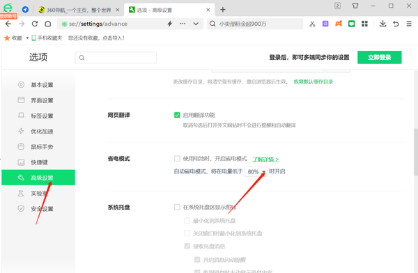 2、我们也可以自定义自动开启省电模式的电量,进入浏览器设置中心,在左侧点击【高级设置】,在右侧列表中找到【省电模式】,在这里即可选择具体的电量,默认是低于60%时自动开启,我们可以按需设置电量。