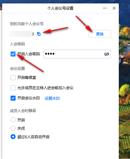 第三步,这时就来到个人会议号设置的窗口中。可以对个人会议号进行更换,也可以修改入会的密码。