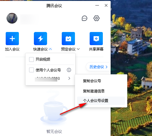 第二步,这时将光标放到自己的会议号上面,就会向右面弹出一个小菜单,点击第三个选项“个人会议号设置”。