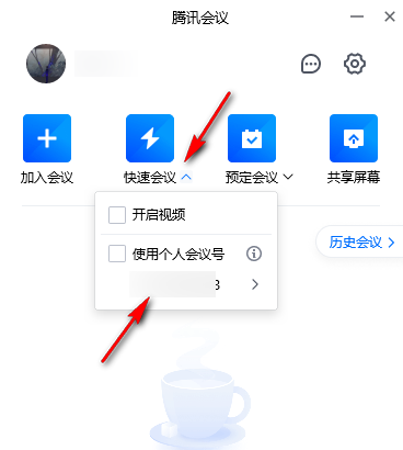 第一步,在电脑上启动“腾讯会议”这款软件,在主页面中点击“快速会议”这个通道,然后点击下拉箭头,在菜单中选择“使用个人会议号”。