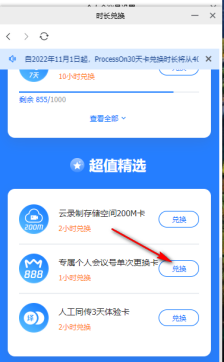 第六步,进入到这个页面以后,点击“超值精选”区域,然后找到“专属个人会议号单次更换卡”,并点击旁边的“兑换”按钮,在弹框中点击“立即兑换”,就兑换成功了。