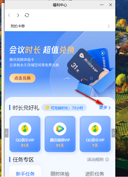第五步,来到“福利中心“这个页面,跟随箭头的指引,点击“更多”选项。