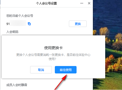 第七步,当我们拥有这张“更换卡”以后,就可以对个人会议号进行修改了,点击刚才更换页面的“前往使用”按钮。
