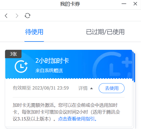 3,进入到如下图所示的“我的卡券”页面,就能够看到“待使用”的卡券以及“已过期和已使用”的卡券,同时在卡券上会标注出有效期和对应的使用时长,点击卡片上的“已使用”按钮,就可以延长会议时间了。