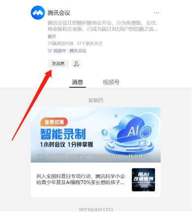 1,可以在微信上搜索“腾讯会议”官方公众号,关注以后,在腾讯会议公众号的主页点击“发消息”这个按钮。