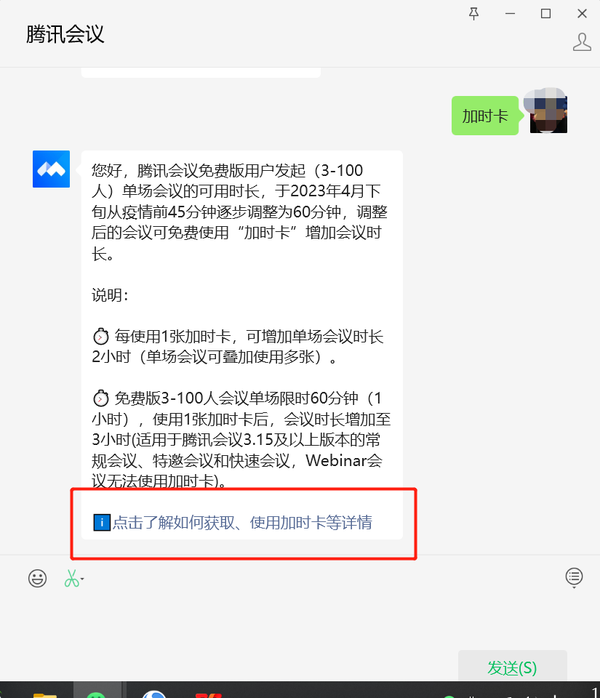 2,进入到聊天框以后,回复“加时卡”三个字,就会自动弹出领取加时卡的链接,点击链接进入,就会自动获取本月的加时卡了。