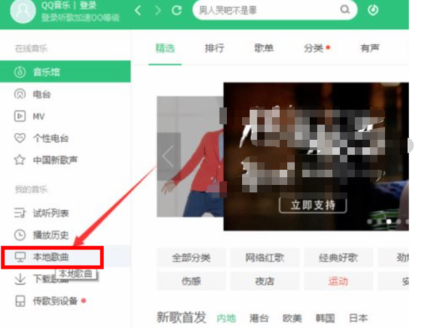 1、首先,打开QQ音乐,在软件主界面,点击左侧的【本地歌曲】分栏;