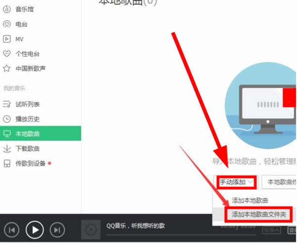 2、随后,位于右下方,我们找到【手动添加】,找到列表选项中的【添加本地歌曲】或者【添加本地歌曲文件夹】,如果大家有多个音频文件在同一个文件夹中需要添加,选择后者即可。