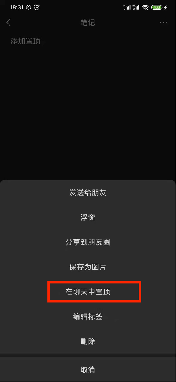 第三步,输入文字后点击右上角的“···?”,在弹出的列表内找到并选择“在聊天中置顶”即可。