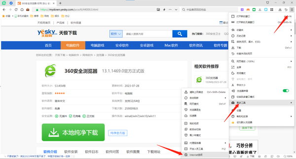 1、打开360安全浏览器,点击右上角的【显示浏览器工具及常用设置选项】,选择【更多工具】,点击【Internet选项】。