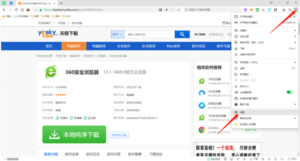 1、点击360安全浏览器右上角的【显示浏览器工具及常用设置选项】,选择【设置】进入。
