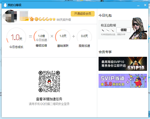 四、进入QQ等级任务中心,可以清楚看到今日已经加速的天数,同时也可以开通QQ会员与超级会员,来额外获得更多倍数的等级加速。