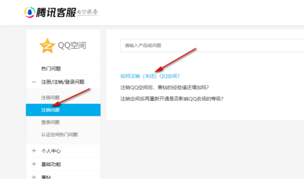 四、进入到下图这个页面以后,在左侧的选项栏中找到“注册/注销/登录问题”,在子菜单中点击“注销”问题,这时右侧就会出现三个问题,点击第一个问题“如何注销(关闭)QQ空间”。