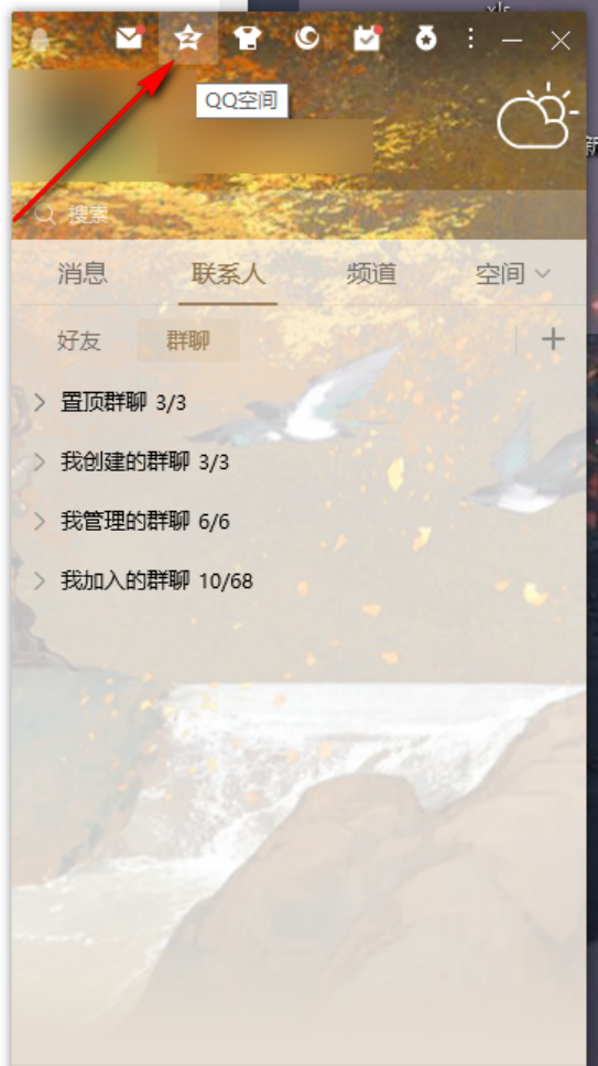一、在电脑上登陆QQ软件,在主面板的上方找到五角星的标志,也就是QQ空间的入口,点击进入。