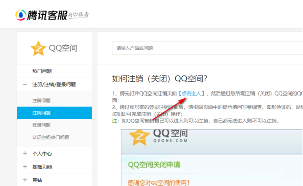五、根据下图指引,点击页面中的蓝色“点击进入”文字,就会跳转到注销关闭QQ空间的页面。