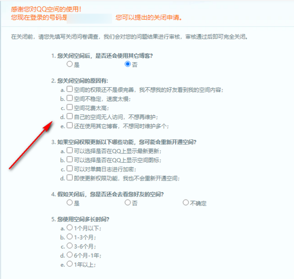 六、如果确定要关闭QQ空间,需要回答以下五个问题,当我们全部回答完毕以后,输入下方的验证码,再点击“提交关闭申请”就可以开始进行等待,一般一到三天内就会收到提示,这时QQ空间就彻底注销完成了。