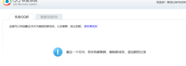 5,现在的腾讯QQ不仅支持恢复误删好友,还可以支持恢复QQ群。在恢复QQ好友的页面切换到恢复QQ群的标签中,就可以对QQ群以相同的方法进行恢复了,因为小编的账号最近一个月内没有解散、删除群成员、退出群的记录,所以呈现下图页面,如果你想要恢复QQ群,快去试一试吧。