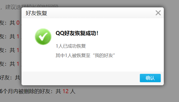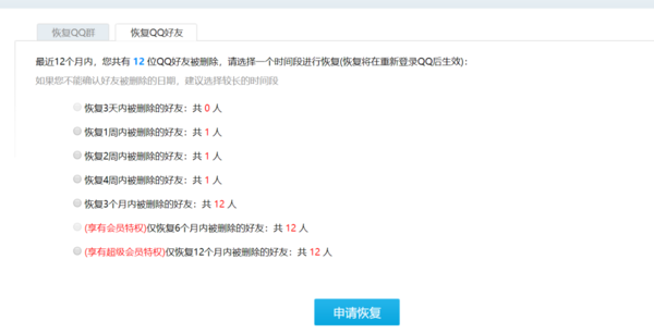 3,再然后,就来到了恢复QQ好友的页面,在这个页面中腾讯QQ为我们统计了最近12个月内该账号删除的QQ好友数量,并为我们提供了多个时间段来进行批量恢复。比如可以恢复三天内、一周、两周、四周、三个月内被删除的好友,如果是QQ会员,还可以恢复6个月内以及12个月内被删除的好友。