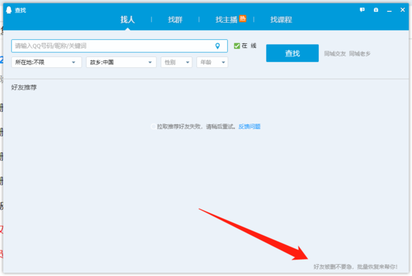 2,然后,在添加好友的面板右下角有一行字样,点击“好友被删不要急,批量恢复来帮你”。