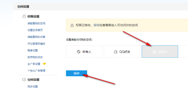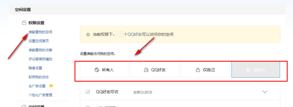 4、如下图页面所展示的,在“权限设置”中点击第一个“谁能看我的空间”字样,然后右侧就会展示出四种选项,分别是所有人、QQ好友、仅自己和自定义。大家可以根据自己的需求来选择不同的选项,比如点击第三个“仅自己”选项就默认了自己的空间不允许任何人进入。