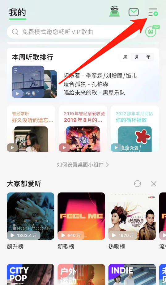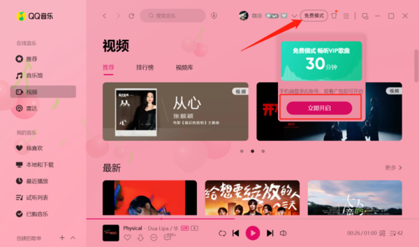 1,首先第一步我们先进入到QQ音乐的主界面,在上方找到“免费模式”这个按钮,也就是红色箭头所指的地方,点击就会出现一个小的页面提示,免费模式可以收听30分钟的VIP歌曲,我们只要点击下方的“立即开启”按钮就可以了。