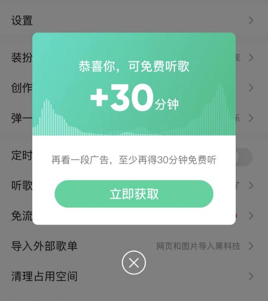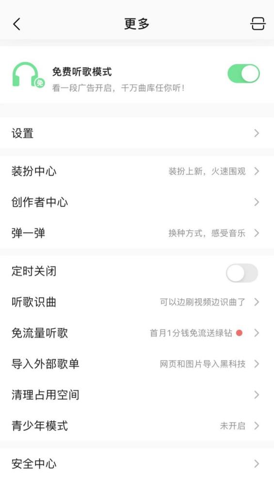 4,在更多设置的页面最上方,就是“免费听歌”模式,将右侧的开关按钮打开,不过需要看一段15秒左右的广告,看完以后就能够开启免费听歌模式,享受30分钟的会员歌曲收听时长。