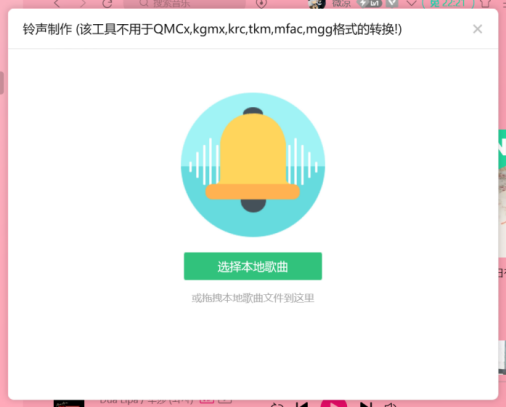 2,来到铃声制作的页面以后,点击“选择本地歌曲”的绿色背景按钮,然后将电脑上的音频文件上传到QQ音乐。