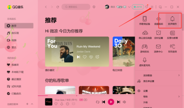 1,首先在电脑上启动QQ音乐客户端,进入主页以后,在上方偏右的位置点击三条线段的图标,在弹出的页面中找到“铃声制作”,点击进入。