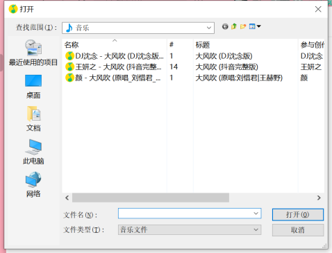 3,之后就会弹出选取音频文件的Windows窗口页面,找到需要剪辑的音频文件,以“大风吹”为例,点击“打开”就上传成功。