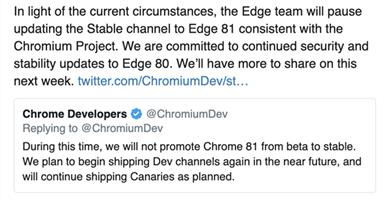 微软Edge浏览器官推宣布,暂停对Microsoft Edge稳定版更新,版本号将暂时停留在80,而非计划更新的81,不过安全更新不受影响。官推表示:“鉴于当前情况,Edge团队将...