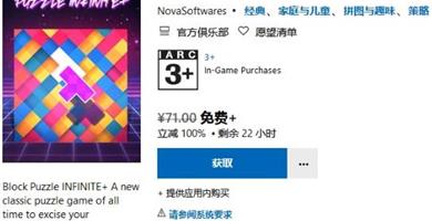 微软商店现已开启对解谜游戏《Block Puzzle INFINITE+》的免费领取活动,距离活动结束仅剩约 20 小时。据悉,该游戏的原价为 71 元,活动时间内可免费领取。《Block Puzzl...