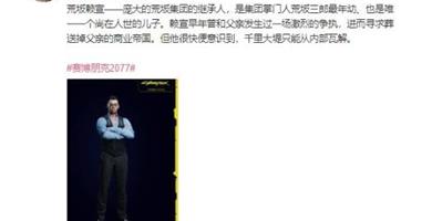 本周一晚间,《赛博朋克 2077》发行商 CDPR 通过官方微博公布了游戏人物 “荒坂赖宣”简介,称其为庞大的荒坂集团的继承人。官方对这名 NPC 的介绍为:荒...